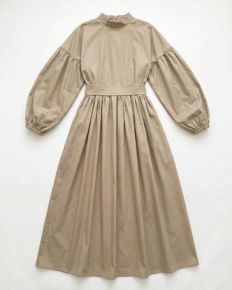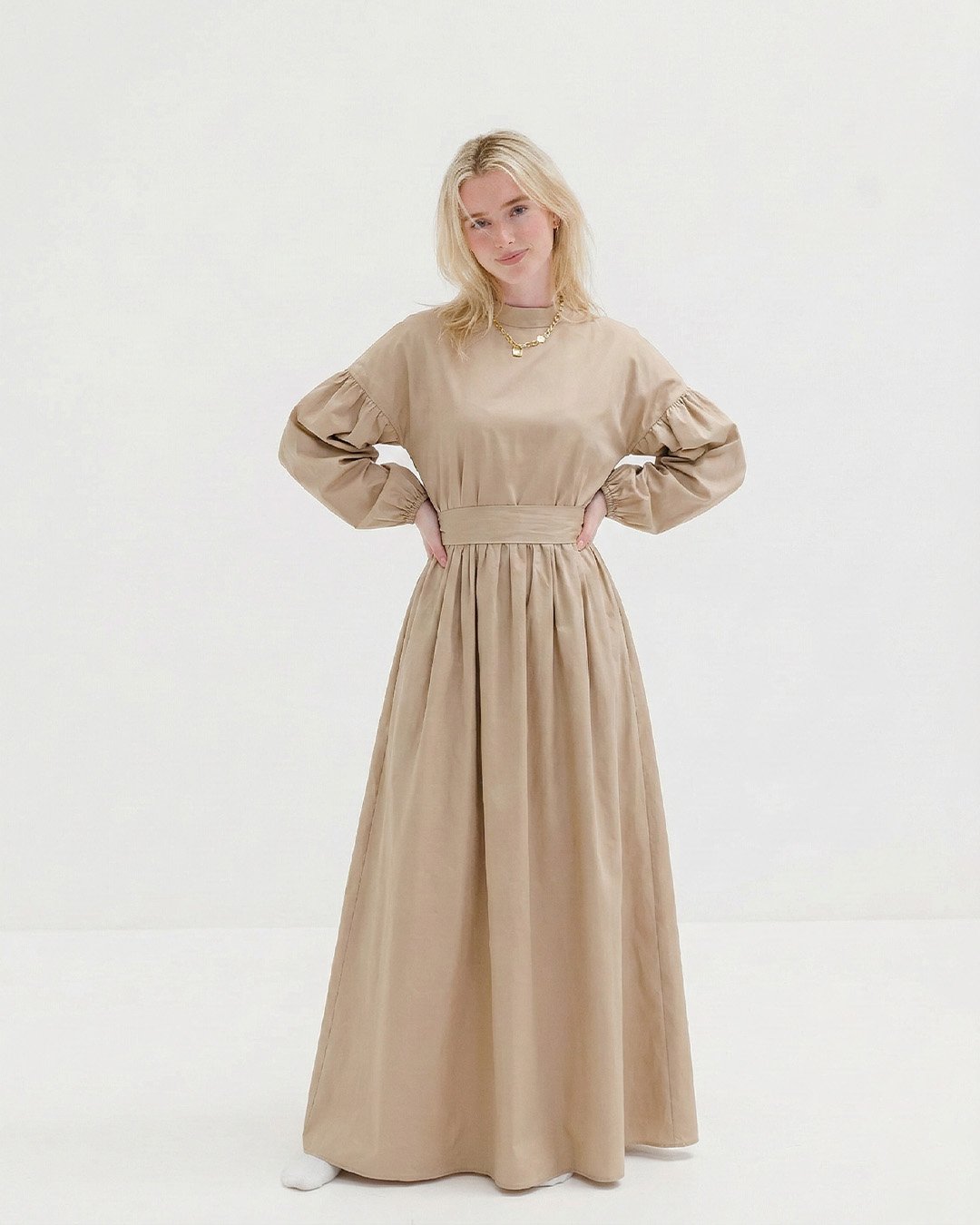 "Elbisenin %100 pamuk dokusu o kadar yumuşak ki, astarsız kullanımda bile inanılmaz bir konfor sunuyor. Kişiye özel boy ölçüsü sayesinde tam istediğim gibi oldu; hakim yaka ve sırt patı detayı ise çok asil bir kapalı form sağlıyor. Kol ucunun lastikli olması kullanım kolaylığı katarken, beldeki büzgü ve modele dahil kemer silüeti harika dengeliyor. Hem şık hem de çok doğal bir parça." - Büşra Nur K.